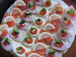 お雑煮・煮物・きんとんなど、いろいろ食べてきました。あと、なんていうのかわからないけどパンのおつまみ。サンドイッチ用のパンを切って、ハムやサーモンなどを乗せたものです。カラフルなので、お正月になると作ります。