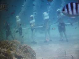 手すりにつかまって海底を歩きます。 魚の餌付け。